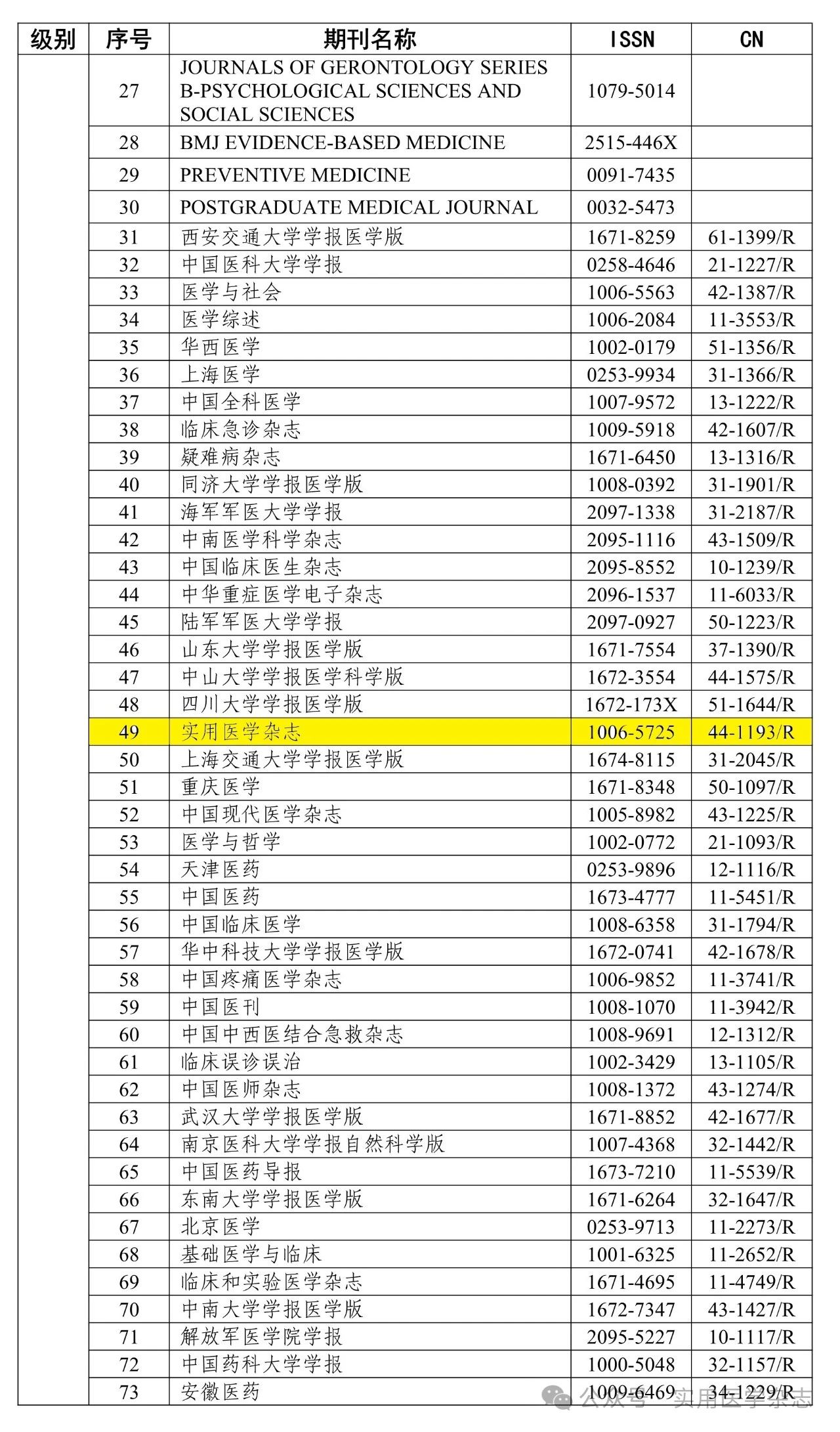 为贯彻落实《中国科协 中宣部 教育部 科技部 关于深化改革 培育世界一流科技期刊的意见》,推动建设中外期刊同质等效的评价导向,引导更多高水平成果在国内期刊发表,中国科协自2019年以来,分批支持全国学会面向学科领域国内外科技期刊,编制发布高质量期刊分级目录,为科技工作者发表论文和科研机构开展学术评价提供参考。每个学科领域的期刊分为T1级,T2级和T3级。T1级表示已经接近或具备国际一流期刊,T2级为国际知名期刊,T3级是指业内认可的较高水平期刊。截至2024年11月底,已增补和修订至第四版,于2024年12月13日正式发布,《实用医学杂志》首次入选“临床医学与内科学综合科技期刊分级目录”T3区。