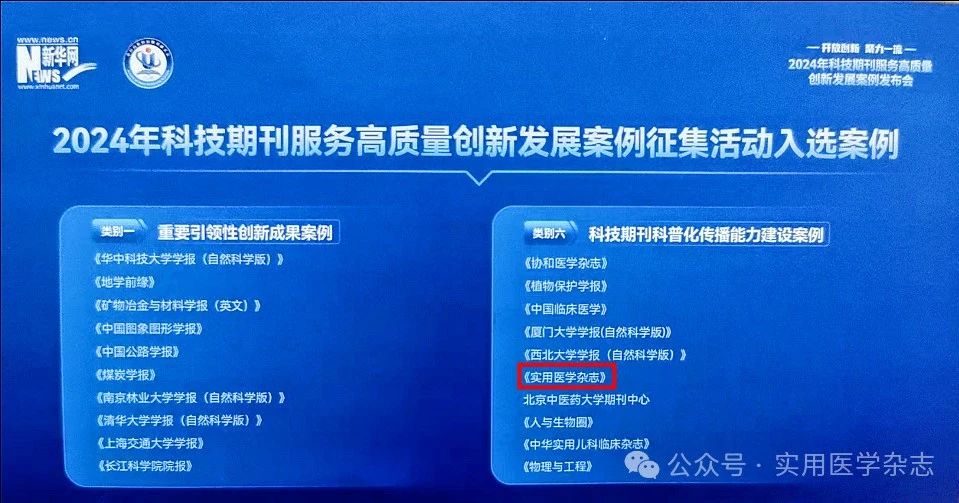 2024年12月26日,由新华网、中国高校科技期刊研究会联合主办的2024年科技期刊服务高质量创新发展案例发布会在京举办。在科技期刊服务高质量创新发展案例发布环节,《实用医学杂志》成功入选“2024年科技期刊服务高质量创新发展案例”之“科技期刊科普化传播能力建设案例”。