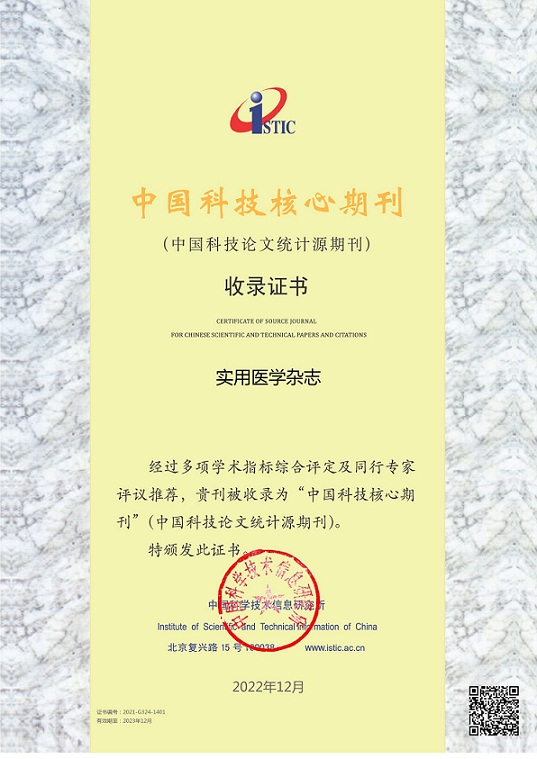 2022年12月29日,中国科学技术信息研究所召开了“2022年中国科技论文统计报告发布会”,会上发布了《2022年版中国科技期刊引证报告(核心版)》。经过多项学术指标综合评定及同行专家评议,《实用医学杂志》继续入选2022年“中国科技核心期刊”(中国科技论文统计源期刊)。自2000年入选以来,我刊连续第22次被评为“中国科技核心期刊”。