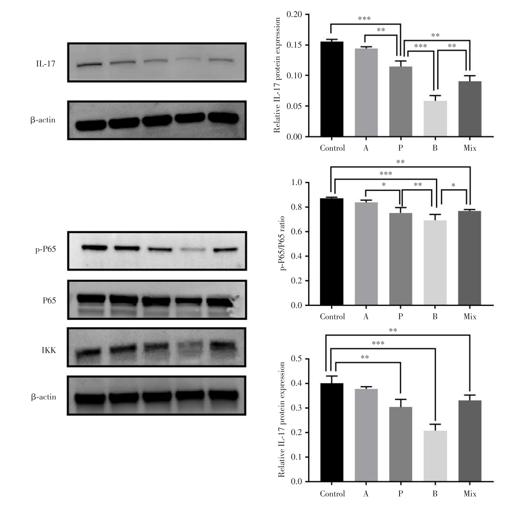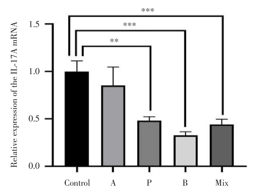 Objective To explore the mechanism of short-chain fatty acids in alleviating γδT cell-mediated inflammatory response. Methods A certain concentration of short-chain fatty acids was used to intervene in rat intestinal-derived γδT cells. CCK-8 was used to detect the effect of shortchain fatty acids on γδT activity. ELISA was used to detect the content of the IL-17A, RT-qPCR was utilized to detect the expression of the IL-17A, and flow cytometry was applied to analyze the IL-17+γδT cell frequency. The effect of SCFAs on IL-17A and NF-κB signaling pathway in γδT cells were observed by Western blot. Results CCK-8 assay showed that the concentration of sodium acetate was less than or equal to 0.5 mmol/L, and the concentrations of sodium propionate, sodium butyrate, and mixed short-chain fatty acids were less than or equal to 0.25 mmol/L, indicating no inhibitory effect on the proliferation of γδT cells. ELISA and RT-qPCR showed that the treatment of γδT cells with sodium propionate, sodium butyrate, and mixed short-chain fatty acids significantly decreased the levels of IL-17A compared with the control group. Flow cytometry revealed a significant decrease in the proportion of IL-17+γδT cells under the treatment of sodium propionate, sodium butyrate, mixed shortchain fatty acids, and TSA intervention. Western blot found that sodium propionate, sodium butyrate, and mixed shortchain fatty acids could inhibit the expression of IL-17A and IKK, as well as the phosphorylation level of NF-κB. Conclusion Shortchain fatty acids could inhibit the activation of IL-17A and NF-κB signaling pathway in γδT cells, thereby alleviating the inflammatory response in the body.