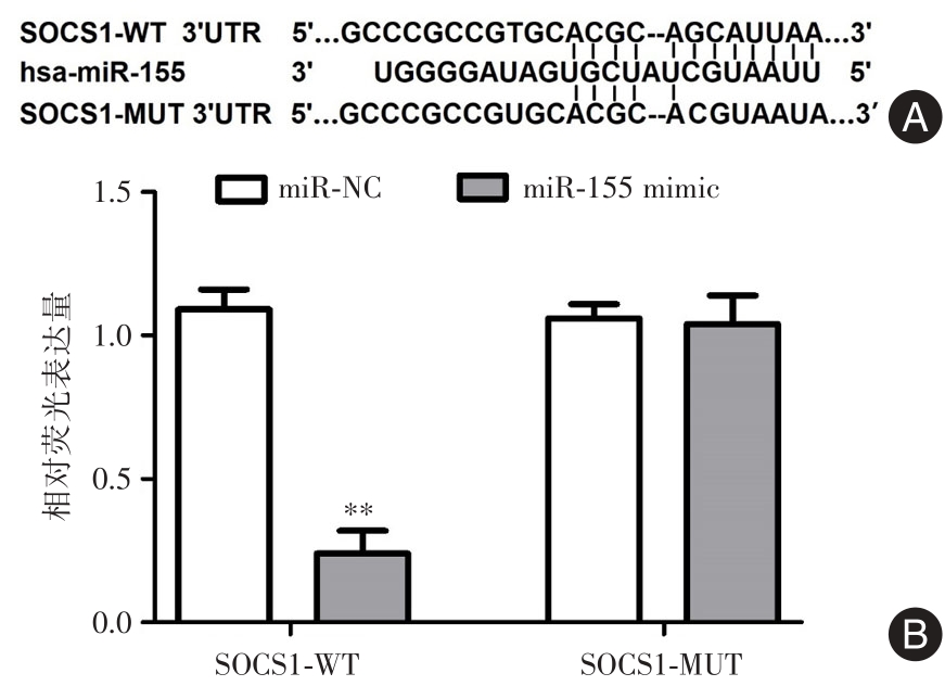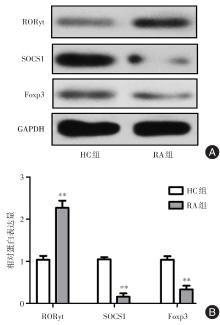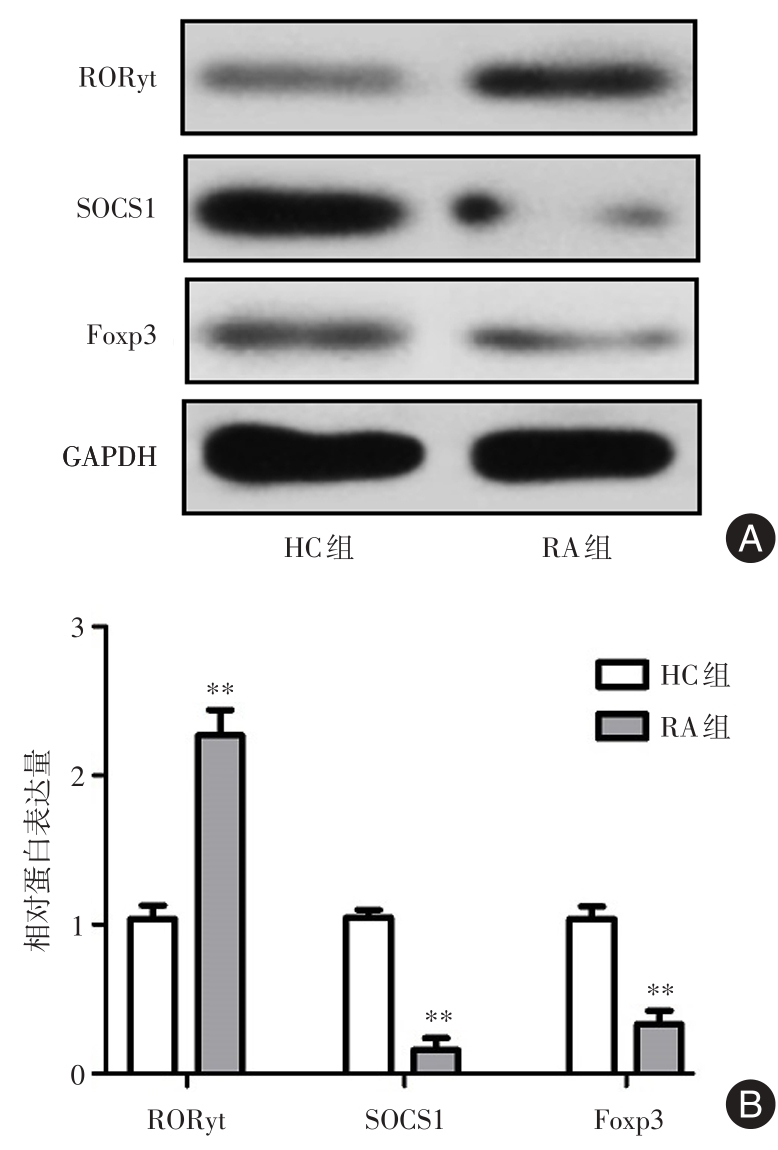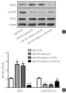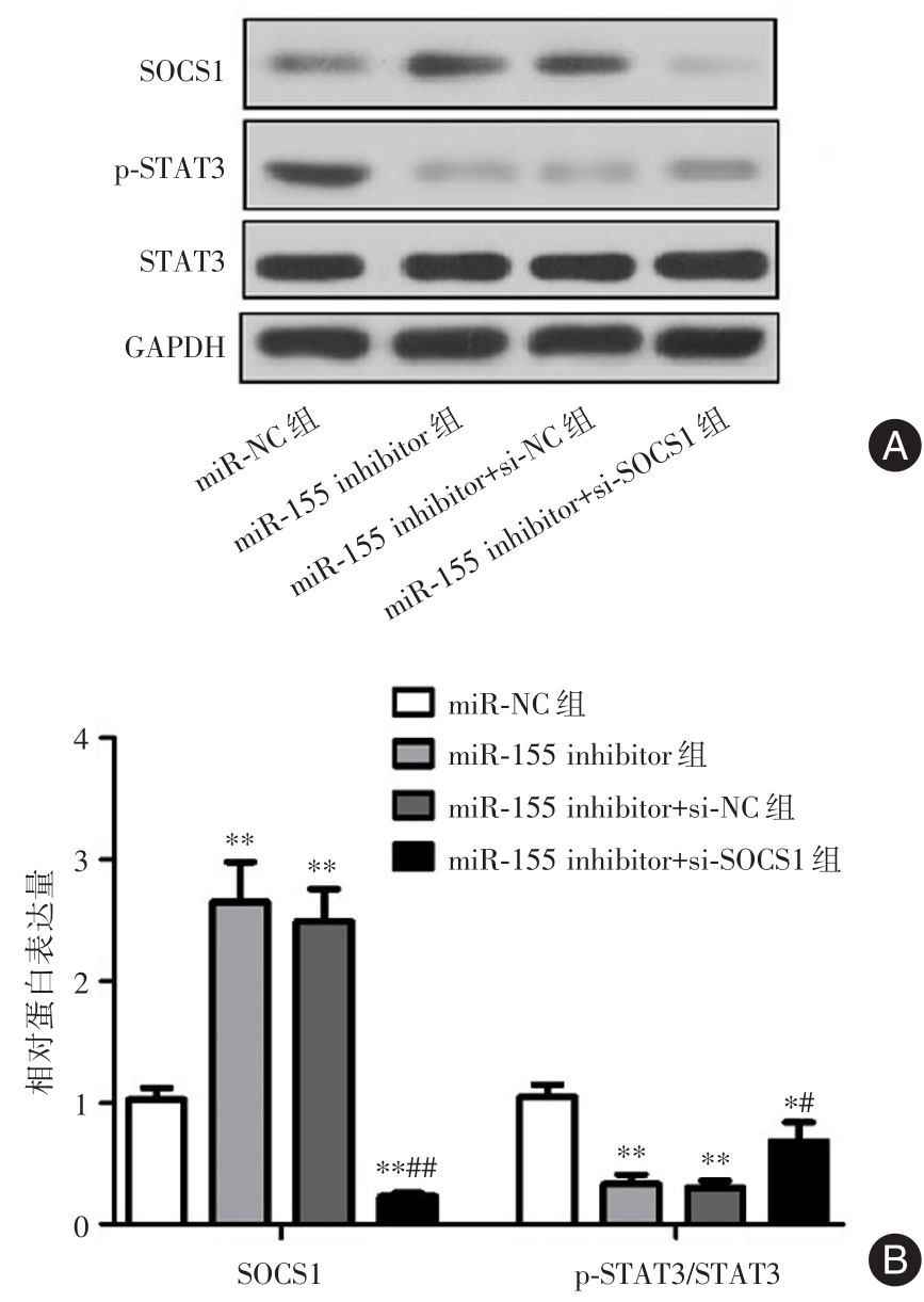 Objective This research aimed to investigate the expression and mechanism of miR-155 and suppressor of cytokine signaling 1 (SOCS1) in rheumatoid arthritis (RA). Methods RT-PCR and flow cytometry were applied to detect the expression differences of miR-155, Th17, and Treg cells in peripheral blood of RA patients (RA group) and control group (HC group). Bioinformatics analysis and dual-luciferase reporter assay were conducted to investigate the regulatory relationship between miR-155 and SOCS1. CD4+T cells were isolated from peripheral blood of RA patients and transfected with miR-155 inhibitor, si-SOCS1, and their respective negative control sequences, and divided into four groups: miR-NC group, miR-155 inhibitor group, miR-155 inhibitor+si-NC group, and miR-155 inhibitor+si-SOCS1 group. The cells were treated with Th17-inducing differentiation medium, and flow cytometry was used to determine the ratio of Th17 cells in each group of CD4+T cells. Western blot was used to determine the ratio of p-STAT3/STAT3 in the cells. Results Compared to the HC group, RA patients showed increased expression of miR-155 and Th17 ratio (P < 0.01), and decreased Treg cell ratio (P < 0.01). MiR-155 could target and inhibit the expression of SOCS1. Compared to the miR-NC group, the miR-155 inhibitor group, miR-155 inhibitor+si-NC group, and miR-155 inhibitor+si-SOCS1 group showed decreased Th17 ratio and p-STAT3/STAT3 ratio (P < 0.01). Compared to the miR-155 inhibitor group, the miR-155 inhibitor+si-SOCS1 group exhibited increased Th17 ratio and p-STAT3/STAT3 ratio in CD4+T cells (P < 0.05). Conclusion Elevated expression of miR-155 in RA patients may mediate the differentiation of CD4+ T cells into Th17 cells through the SOCS1/STAT3 pathway, contributing to the imbalance of Th17/Treg cells in peripheral blood of RA patients.