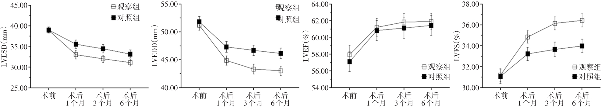 LVEDD(mm) | 观察组(n = 84) | 51.17 ± 4.03 | 44.85 ± 3.92?# | 43.31 ± 4.05?# | 43.01 ± 3.87?# |