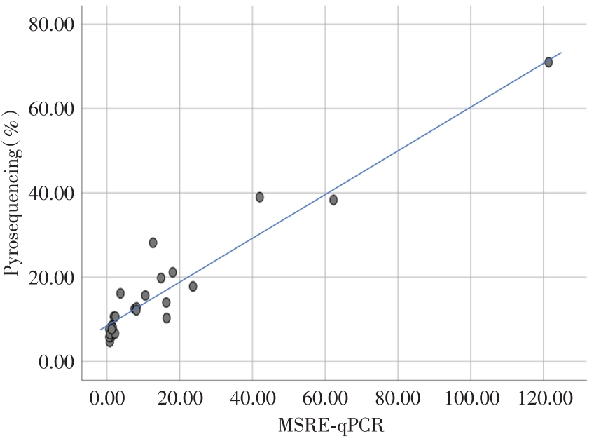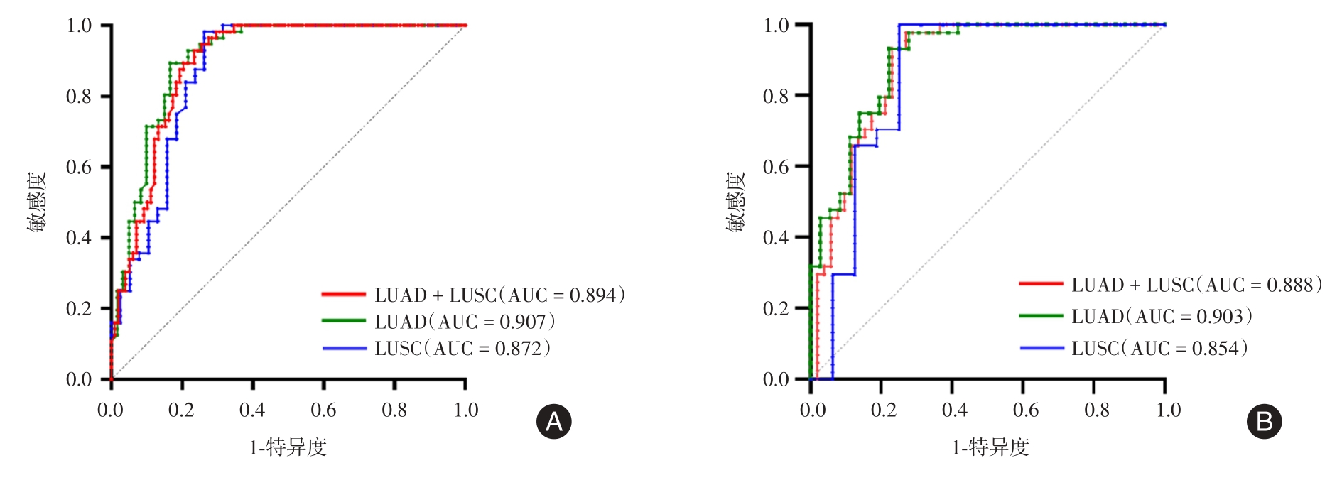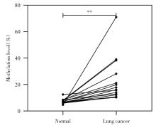 Objective To evaluate the methylation levels of DNA at six specific CpG sites located in the mRNA region of histone cluster 4 subfamily F member 6 (HIST1H4F) gene and determine their diagnostic significance about lung cancer. Methods The DNA methylation levels of 15 cases of lung cancer and adjacent paired normal lung tissue were detected using pyrophosphate sequencing. Based on preliminary evaluation, a methylation-sensitive restriction enzyme-fluorescence quantitative PCR (MSRE-qPCR) method was developed to detect DNA methylation levels in the test group (60 cases of lung adenocarcinoma, 38 cases of squamous cell carcinoma, 30 cases of benign diseases, and 26 cases of normal lung tissue) and the validation group (36 cases of lung adenocarcinoma, 16 cases of squamous cell carcinoma, 21 cases of benign diseases, and 23 cases of normal lung tissue). The diagnostic value was evaluated using ROC curves. Results The results of pyrophosphate sequencing showed that the methylation levels of lung cancer were significantly higher than that of paired normal lung tissue (P < 0.005). The detection results of MSRE-qPCR showed that the areas under the ROC curve for diagnosing lung cancer in the test group and validation group were 0.894 and 0.888, with sensitivity of 76.5% and 73.1%, and specificity of 92.9% and 97.7%, respectively. The methylation levels were significantly positively correlated with smoking in lung cancer patients (r = 0.273, P < 0.01). Conclusion The six CpG sites in the mRNA region of the HIST1H4F gene can serve as biomarkers for diagnosing lung cancer, providinga new molecular target for clinical lung cancer diagnosis.