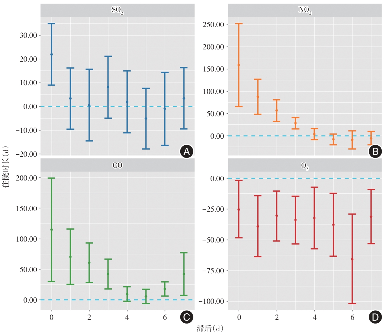 The associations of air pollution increasing(each IQR) with hospital admission, hospital cost and the length of hospitalization in different lag days(0-7days)"