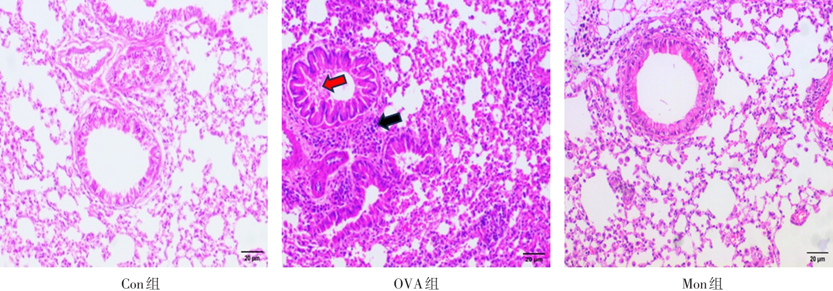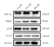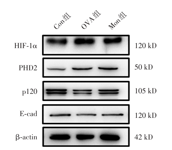 Objective The study aimed to investigate whether montelukast sodium could alleviate airway inflammatory responses in asthmatic mice by affecting the PHD2/HIF?1α pathway. Methods An allergic asthma model was established by ovalbumin (OVA) induction, and 18 female BALB/c mice were randomly divided into a control group (Con group), an asthma group (OVA group), and an asthma group with montelukast sodium intervention (30 mg/kg montelukast sodium by oral administration 1 h before OVA challenge, Mon group). HE staining was used to analyze the pathological changes in the lungs of mice. Blood cell analyzer and kits were used to determine the number of inflammatory cells and the levels of cytokines, the content of lactic acid and pyruvic acid in the lungs, respectively. RT?PCR and Western blot were used to detect the mRNA and protein expression of HIF?1α, PHD2, E?cad and p120 in the lungs of mice. Results Compared with the Con group, there was a significant increase in the number of eosinophils, lymphocytes, neutrophils and monocytes, the levels of IL?5, IL?13, complement factor D (CFD) and contents of lactate and pyruvate in the lungs of mice in the OVA group. Lung HIF?1α, PHD2, p120 and E?cad mRNA levels were reduced, meanwhile HIF?1α and PHD2 protein expression were upregulated but E?cad and p120 protein expression were downregulated (all with P < 0.05). After montelukast sodium intervention, the number of eosinophils and monocytes and CFD expression were significantly decreased in the lungs of Mon group, the contents of lactate and pyruvate were basically restored to normal, and the mRNA and protein expression of HIF?1α, PHD2, p120 and E?cad were effectively improved. Conclusion Montelukast sodium could alleviate the airway inflammatory responses in the lungs of asthmatic mice by regulating the PHD2/ HIF?1α signaling pathway.