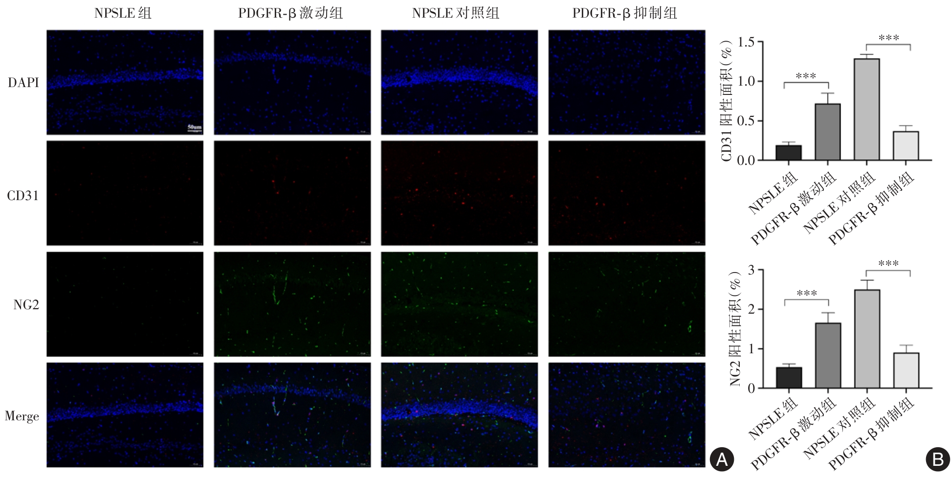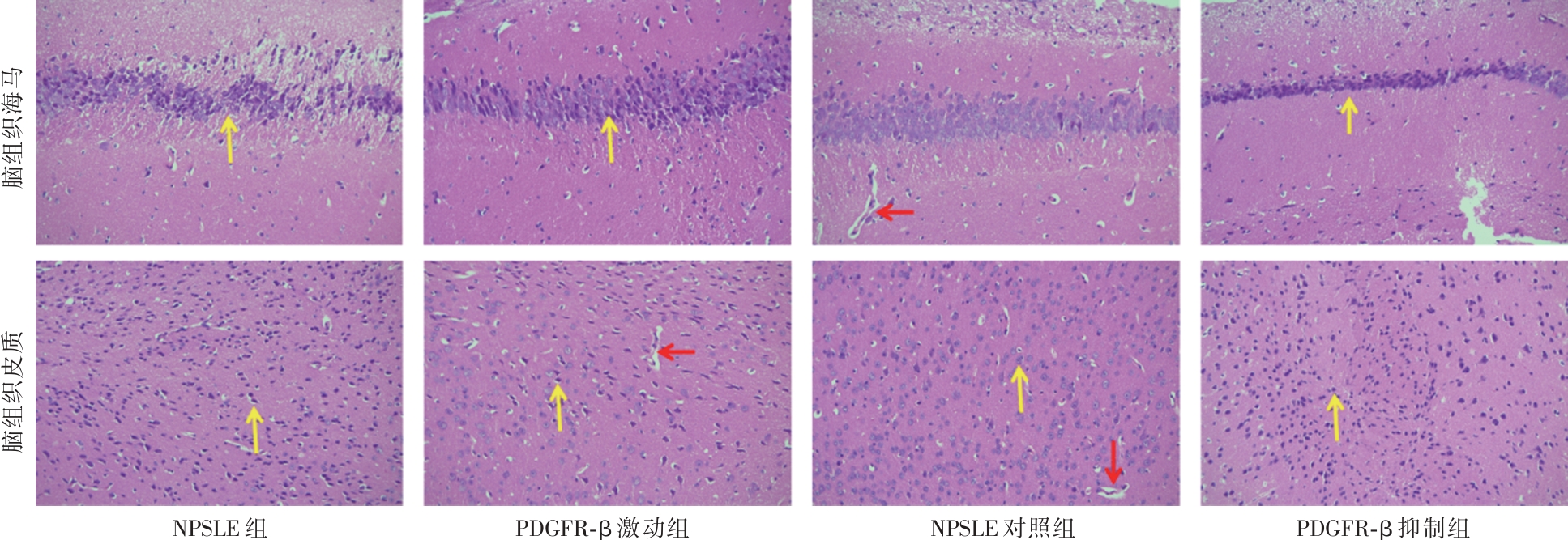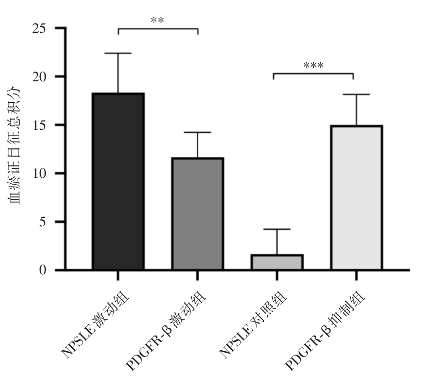 Objective This study aims to investigate the pathological role and molecular mechanisms of pericyte depletion in neuropsychiatric lupus (NPSLE) and to assess the potential of the PDGFR-β signaling pathway as a novel therapeutic target for NPSLE. Methods NPSLE models were established using 8-week-old female MRL/lpr mice, from which those exhibiting abnormal behaviors were selected for further analysis. The PDGFR-β signaling pathway was modulated using an agonist to promote pericyte proliferation or an inhibitor to suppress pericyte apoptosis. The effects of these treatments on blood-brain barrier (BBB) integrity, eye-signs in blood stasis syndrome, neuronal integrity, and tight junction protein expression were evaluated. Evans blue staining, H&E staining, Nissl staining, and immunofluorescence staining were employed to assess the expression of tight junction proteins (Cadherin, ZO-1), endothelial cell markers (CD31), and pericyte markers (NG2). Results Mice in the NPSLE group exhibited significant anxiety, depression, and cognitive impairment. In the PDGFR-β inhibition group, eye-signs in blood stasis syndrome scores were significantly elevated (P < 0.01), BBB permeability was markedly increased (P < 0.001), neuronal numbers were significantly reduced, tight junction protein expression was diminished, and pericyte depletion was aggravated. Conversely, the PDGFR-β agonist group showed a significant reduction in eye-signs in blood stasis syndrome scores (P < 0.01), improved pericyte survival, enhanced expression of tight junction proteins, reduced neuronal damage, and restoration of BBB function (P < 0.001). Immunofluorescence staining further confirmed that PDGFR-β activation significantly protected pericytes. Conclusions Pericyte depletion is closely associated with increased BBB permeability and exacerbation of eye-signs in blood stasis syndrome. Modulation of the PDGFR-β signaling pathway may provide a promising therapeutic strategy for NPSLE.