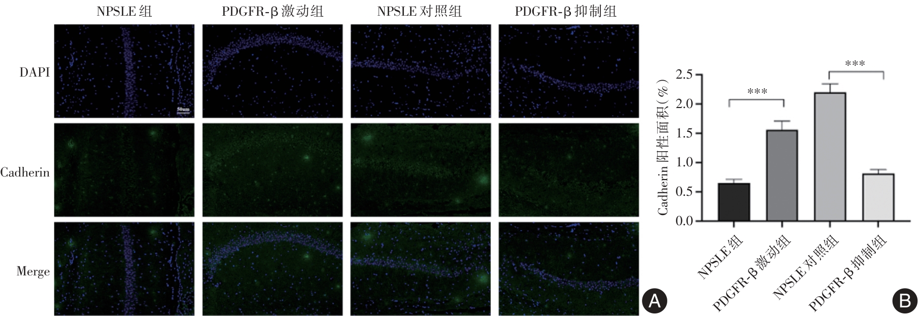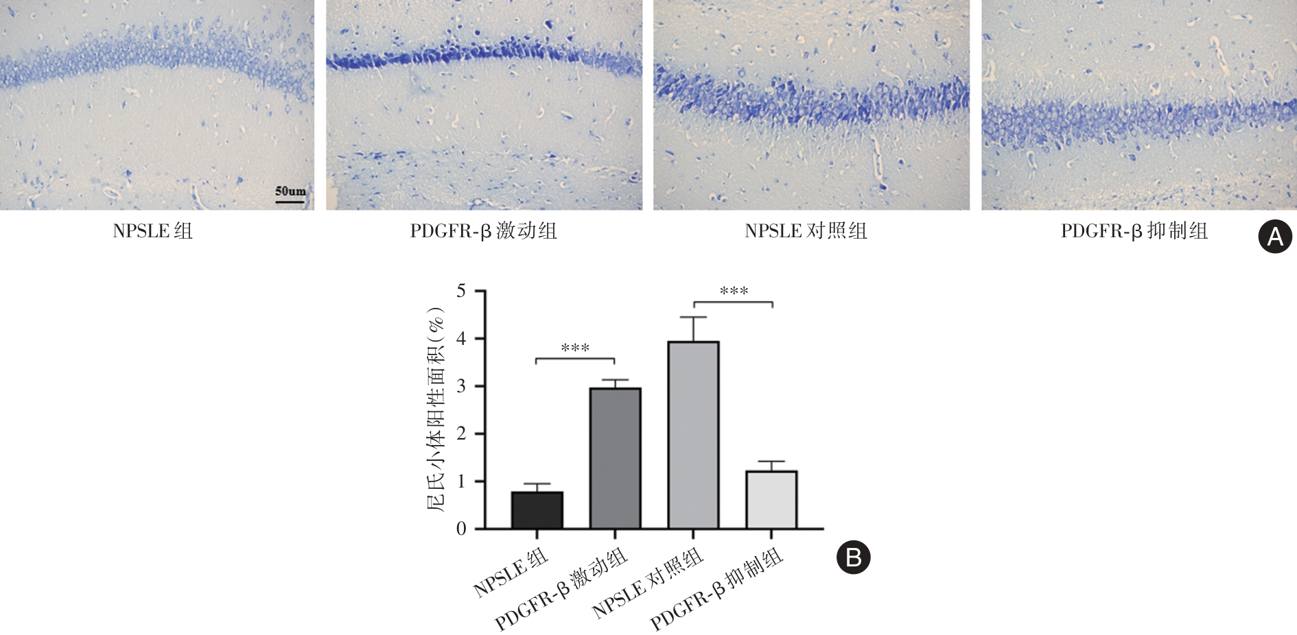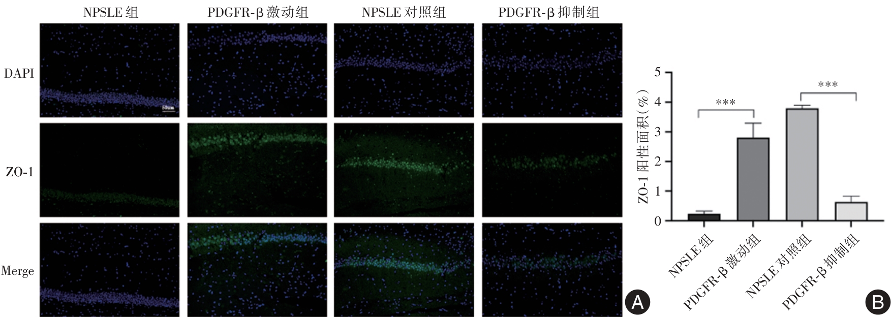 Objective This study aims to investigate the pathological role and molecular mechanisms of pericyte depletion in neuropsychiatric lupus (NPSLE) and to assess the potential of the PDGFR-β signaling pathway as a novel therapeutic target for NPSLE. Methods NPSLE models were established using 8-week-old female MRL/lpr mice, from which those exhibiting abnormal behaviors were selected for further analysis. The PDGFR-β signaling pathway was modulated using an agonist to promote pericyte proliferation or an inhibitor to suppress pericyte apoptosis. The effects of these treatments on blood-brain barrier (BBB) integrity, eye-signs in blood stasis syndrome, neuronal integrity, and tight junction protein expression were evaluated. Evans blue staining, H&E staining, Nissl staining, and immunofluorescence staining were employed to assess the expression of tight junction proteins (Cadherin, ZO-1), endothelial cell markers (CD31), and pericyte markers (NG2). Results Mice in the NPSLE group exhibited significant anxiety, depression, and cognitive impairment. In the PDGFR-β inhibition group, eye-signs in blood stasis syndrome scores were significantly elevated (P < 0.01), BBB permeability was markedly increased (P < 0.001), neuronal numbers were significantly reduced, tight junction protein expression was diminished, and pericyte depletion was aggravated. Conversely, the PDGFR-β agonist group showed a significant reduction in eye-signs in blood stasis syndrome scores (P < 0.01), improved pericyte survival, enhanced expression of tight junction proteins, reduced neuronal damage, and restoration of BBB function (P < 0.001). Immunofluorescence staining further confirmed that PDGFR-β activation significantly protected pericytes. Conclusions Pericyte depletion is closely associated with increased BBB permeability and exacerbation of eye-signs in blood stasis syndrome. Modulation of the PDGFR-β signaling pathway may provide a promising therapeutic strategy for NPSLE.