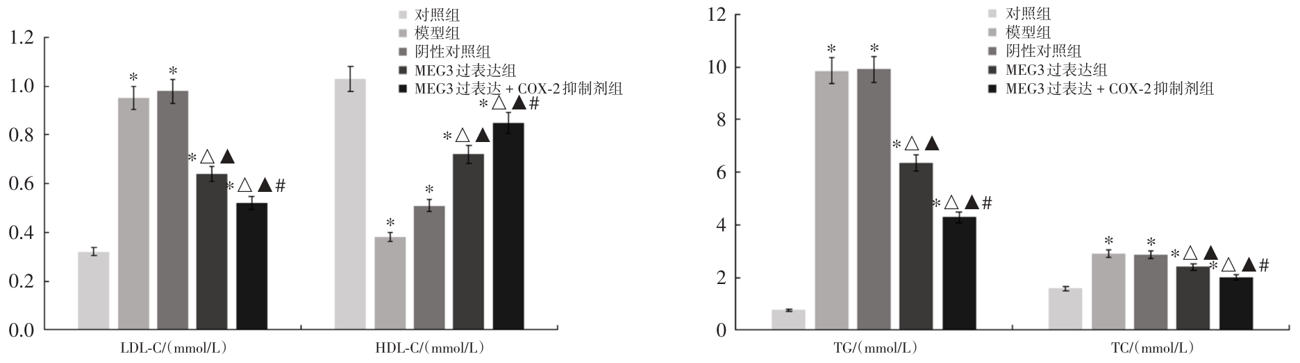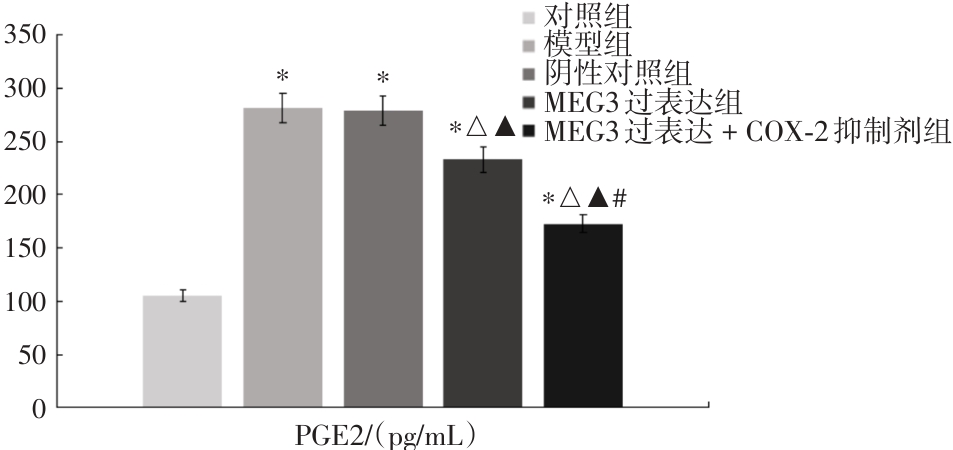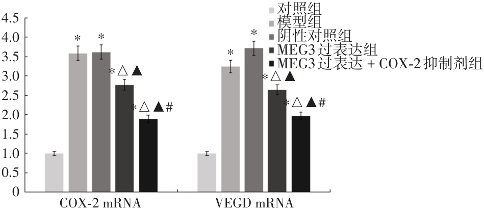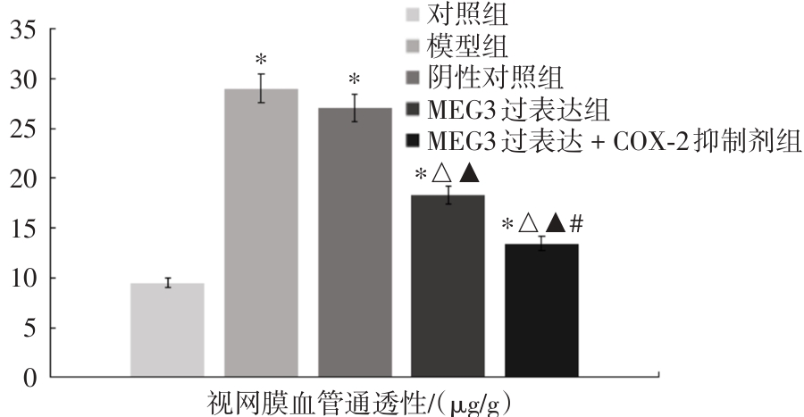 Objective To investigate the protective effect of LncRNA MEG3 on the retina in early-stage diabetic rats through regulation of the COX-2/PGE2/VEGF signaling pathway. Methods 50 male SD rats of SPF grade were selected for the study. Among them, 10 rats were assigned to the control group, while 40 rats were used to establish diabetic retinopathy models. A total of 32 rats successfully underwent modeling and were subsequently divided into four groups (n = 8 per group): model group, negative control group, MEG3 overexpression group, and MEG3 overexpression + COX-2 inhibitor group. Histopathological changes, vascular permeability, glucose and lipid metabolism, inflammatory factors, oxidative stress indices, PGE2 levels, as well as the relative mRNA and protein expression levels of COX-2 and VEGF were evaluated in each group. Results Compared with the control group, HDL-C, CAT, GSH-PX, and SOD levels were significantly decreased, whereas the mRNA and protein expression levels of vascular permeability, TG, TC, LDL-C, IL-6, IL-1β, TNF-α, MDA, PGE2, COX-2, and VEGF were significantly increased in the model group (P < 0.05). Compared with the negative control group, HDL-C, CAT, GSH-PX, and SOD levels were significantly increased in the MEG3 overexpression group, while the mRNA and protein expression levels of vascular permeability, TG, TC, LDL-C, IL-6, IL-1β, TNF-α, MDA, PGE2, COX-2, and VEGF were significantly decreased (P < 0.05). Compared with the MEG3 overexpression group, HDL-C, CAT, GSH-PX, and SOD levels were further increased in the MEG3 overexpression + COX-2 inhibitor group, and the mRNA and protein expression levels of vascular permeability, TG, TC, LDL-C, IL-6, IL-1β, TNF-α, MDA, PGE2, COX-2, and VEGF were further decreased (P < 0.05). Conclusion LncRNA MEG3 is capable of regulating the COX-2/PGE2/VEGF pathway, enhancing glucose and lipid metabolism in rats, suppressing the expression of inflammatory factors, attenuating stress responses, and alleviating diabetic retinopathy.