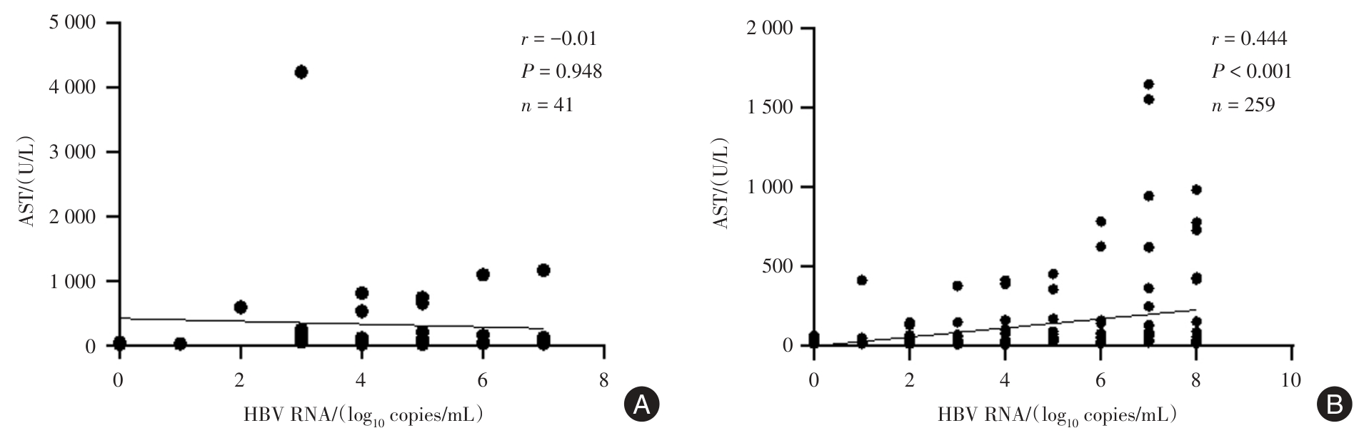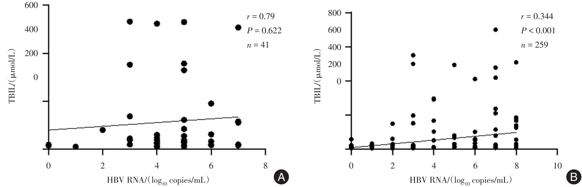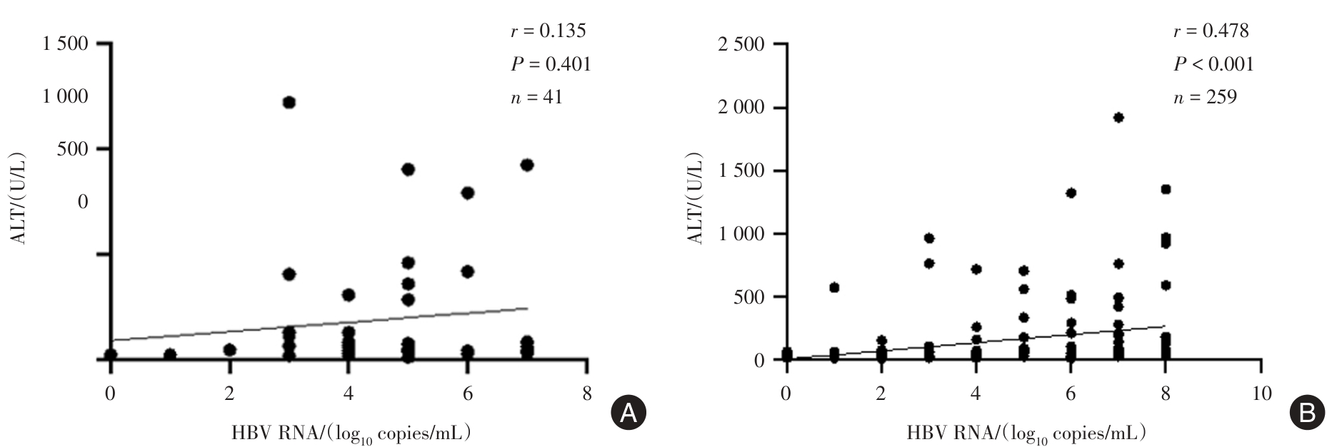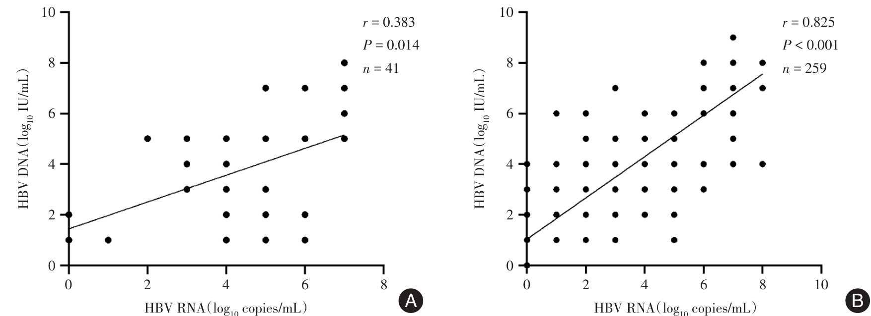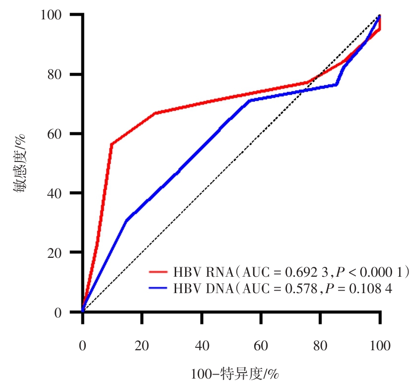 Objective To investigate the expression of HBV RNA in hepatitis B virus?associated hepatocellular carcinoma (HBV?HCC). Methods A total of 259 patients with chronic hepatitis B (CHB) and 41 HBV?HCC patients treated in the outpatient or inpatient department of the Affiliated Hospital of Zunyi Medical University from December 2023 to January 2025 were enrolled as subjects. The differences in age, sex, and levels of HBV RNA, HBV DNA, ALT, AST, and TBIL between the two groups were compared. Differences in viral load between HBV RNA and HBV DNA within each group were compared. Correlations between HBV RNA and HBV DNA, ALT, AST, and TBIL within each group were analyzed. Diagnostic efficacy of HBV RNA for HBV?HCC was determined using receiver operating characteristic (ROC) curve analysis. Results The HBV?HCC group had significantly higher HBV RNA load, HBV RNA positivity rate, ALT, AST and TBIL levels and proportion of male patients and older age compared to the CHB group (P < 0.05). Scatter plot analysis revealed a higher HBV DNA load compared to the HBV RNA load in the CHB group (P < 0.000 1). Correlation analysis showed that HBV RNA was positively correlated with HBV DNA in both groups (P < 0.05). In the CHB group, HBV RNA was positively correlated with ALT, AST and TBIL (P < 0.001). The ROC curve showed that the area under the curve (AUC) for HBV RNA was 0.6923 (P < 0.000 1), with an optimal cut?off value of ≥ 2.5 log10 copies/mL for diagnosing HBV?HCC. Conclusion Serum HBV RNA levels demonstrate high sensitivity and specificity for identifying HBV?HCC and can serve as a reliable indicator for predicting the occurrence of HBV?HCC.