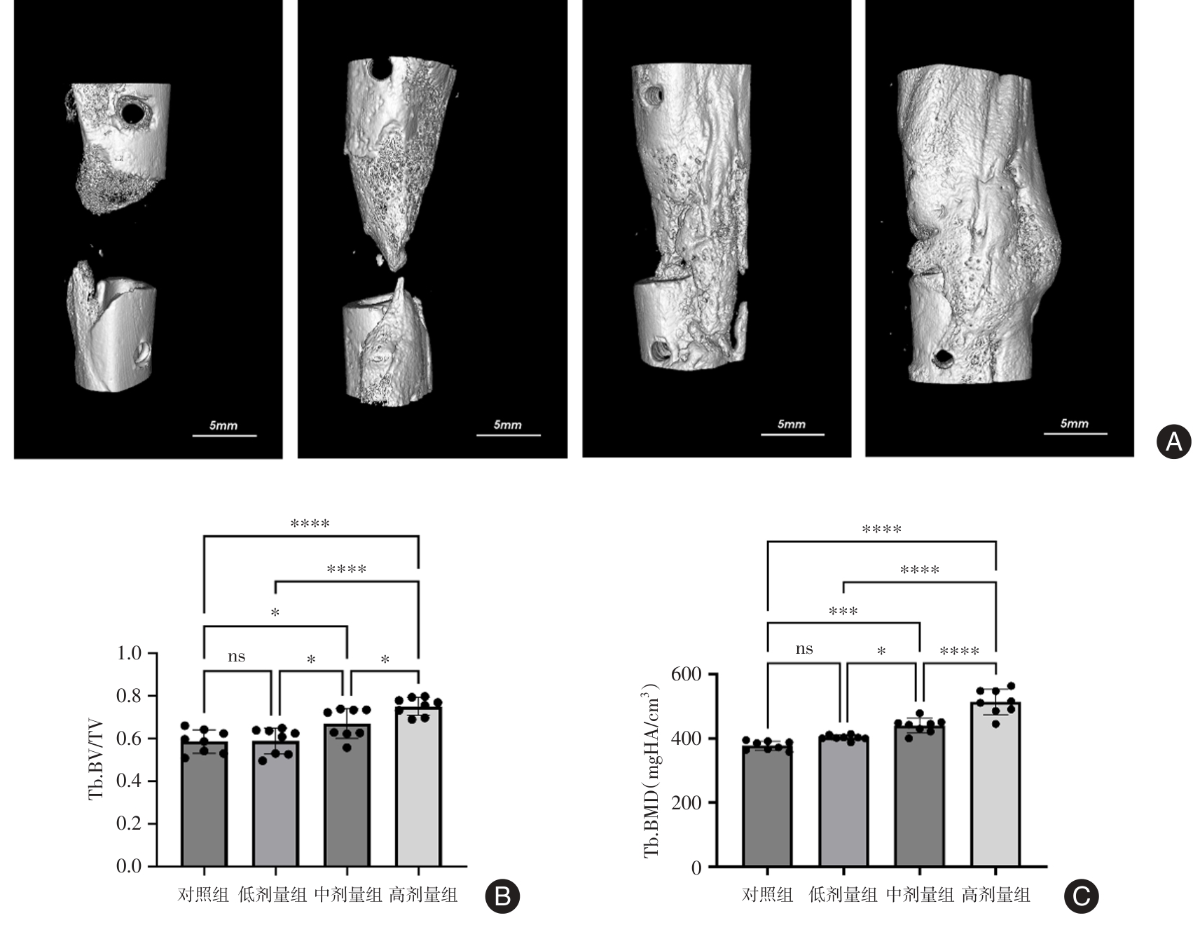Objective To explore the effects of the Bushen Huoxue traditional Chinese medicine, the compound Shangke Jiuwei Jiangu tablet, on bone healing in the distraction osteogenesis model, and to preliminarily expound its action mechanism at the molecular and cellular levels. Methods The tibial distraction osteogenesis models of rabbits were constructed and then randomly divided into a control group, a low-dose traditional Chinese medicine (TCM) group, a medium-dose TCM group, and a high-dose TCM group. After the intervention, the morphology of the bone callus was evaluated through Micro-CT scanning and three-dimensional reconstruction, and the bone volume fraction (BV/TV) and bone mineral density (BMD) were calculated. HE staining was carried out on tissue sections to observe the histological structure of the callus. In the in-vitro experiment, the effects of drug serum on the migration ability of bone marrow mesenchymal stem cells (MSCs) were detected using the Transwell assay. The tendency of cell directional differentiation was evaluated through osteogenic/adipogenic induction differentiation experiments. The expression levels of Sdf-1, Cxcr4, Runx2, and Ocn mRNA in MSCs were detected by RT-PCR. Results Compared with the control group, Micro-CT revealed that the width of the fracture line decreased and the number of calluses increased in all TCM groups. The effect was most significant in the high-dose group, where continuous calluses were observed and the fracture line basically disappeared. BV/TV and BMD detection indicated that the bone healing indexes were significantly improved in the TCM groups (P < 0.05), showing a dose-dependent relationship. Histological examination showed that the callus maturity was the highest in the high-dose group, and the transformation from braided bone to lamellar bone was active. In the in-vitro experiment, the migration rate of MSCs was significantly increased in the drug serum group (P < 0.000 1). Osteogenic differentiation was enhanced while adipogenic differentiation was inhibited, and the expressions of Sdf-1, Cxcr4, Runx2, and Ocn mRNA were all significantly up-regulated (P < 0.000 1). Conclusions Shangke Jiuwei Jiangu tablets may promote the migration of MSCs by activating the Sdf-1/Cxcr4 signaling axis and induce their osteogenic differentiation. Consequently, this can promote the formation, mineralization, and maturation of new bones during the distraction osteogenesis process both in vivo and in vitro. Its mechanism of action highly aligns with the Bushen Huoxue Jiangu method in TCM.