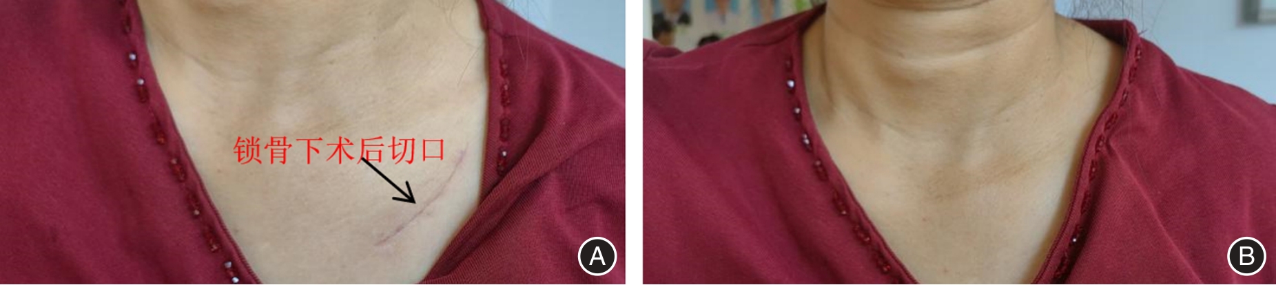 Objective To evaluate the safety and feasibility of a novel self-made retractor in subclavian approach endoscopic thyroid surgery. Methods A retrospective analysis was conducted on 180 cases of unilateral papillary thyroid carcinoma surgery performed at the Thyroid Hernia Surgery Department of the First Affiliated Hospital of South Gannan Medical University from January 2023 to April 2025. Among these, 57 cases underwent non-inflated thyroid surgery using the novel non-inflated retractor (subclavian group), 50 underwent pneumatic transsternal thyroid surgery (transsternal group), and 73 underwent traditional open thyroid surgery (open group). Differences in surgical indicators, postoperative complication rates, and postoperative incision satisfaction were compared among the three groups. Results Compared with the open group, patients in the subclavian group were younger [(40.3 ± 9.4) years vs. (44.8 ± 9.4) years, P < 0.05] and underwent longer surgery duration [(81.68 ± 12.08) min vs. (73.01 ± 10.04) min, P < 0.05]. However, the subclavian group exhibited lower postoperative pain scores on the first day [(2.28 ± 0.92) points vs. (4.19 ± 1.35) points, P < 0.05] and higher patient satisfaction with postoperative incisions. Compared with the thoracic-mammary group, patients in the subclavian group were older [(40.3 ± 9.4) years vs. (34.9 ± 8.2) years, P < 0.05] and had shorter operative times [(81.68 ± 12.08) min vs. (98.18 ± 15.14) min, P < 0.05]. Additionally, patients in the subclavicular group exhibited lower postoperative pain scores on day 1 [(2.28 ± 0.92) points vs. (3.12 ± 1.02) points, P < 0.05] and lower total postoperative drainage volume [80 (70, 100) mL vs. 120 (100, 150) mL, P < 0.05]. No significant differences were observed between groups in terms of incision satisfaction. There were no statistically significant differences among the three groups in terms of the number of lymph nodes removed, intraoperative blood loss, white blood cell count on postoperative day 1, parathyroid hormone, calcium ion concentration, or postoperative complications(P > 0.05). Conclusion The novel non-inflatable retractor effectively maintains the necessary surgical space during subclavicular approach thyroid endoscopic surgery, offering high surgical safety. Compared to traditional open surgery and trans-sternal endoscopic approaches, subclavicular endoscopic thyroid surgery demonstrates reliable therapeutic efficacy and excellent cosmetic outcomes.