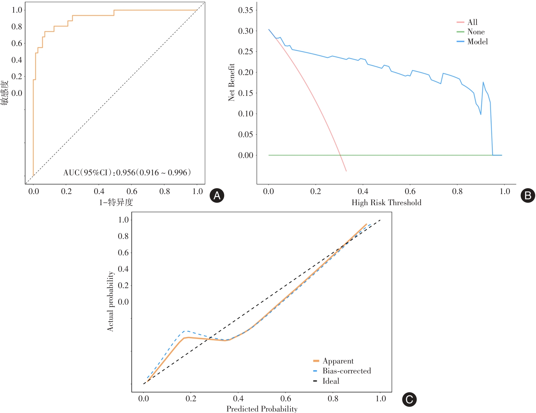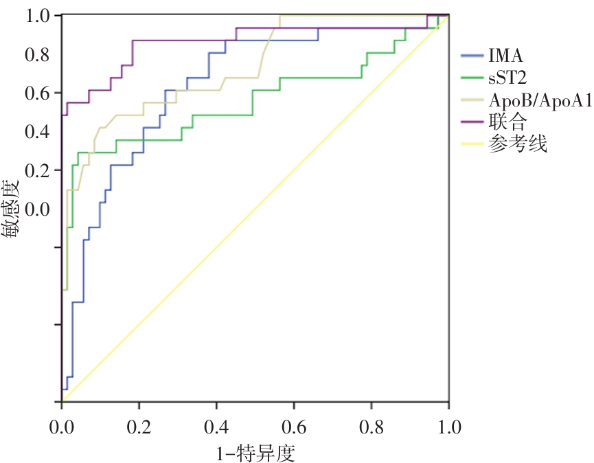 Objective To explore the relationship between serum ischemia-modified albumin (IMA), soluble growth stimulation expressed gene 2 protein (sST2), apolipoprotein B (ApoB)/ApoA1 and poor ST segment regression in electrocardiogram after percutaneous coronary intervention (PCI) in patients with acute ST-segment elevation myocardial infarction (STEMI). Methods A total of 102 STEMI patients who received PCI treatment in the emergency department of the Second Affiliated Hospital of Anhui Medical University between September 2022 and September 2025 were selected. These patients were then divided into the poor regression group (with an ST-segment regression rate < 50%, n = 31) and the good regression group (with an ST-segment regression rate ≥50%, n = 71) based on the ST-segment regression rate of the postoperative electrocardiogram. The levels of serum IMA, sST2, and ApoB/ApoA1 were compared between the two groups before PCI and 2 hours after PCI. Demographic data, medical history data, and PCI-treatment-related data of the two groups were collected to screen for the influencing factors of poor ST-segment regression after STEMI. The predictive value of preoperative serum IMA, sST2, and ApoB/ApoA1 for poor ST-segment regression was analyzed. Results Among the 102 patients, 31 (30.39%) exhibited poor electrocardiogram regression 2 hours after the operation, and 71 (69.61%) showed good regression. The percentages of patients with a time from onset to admission > 6 hours, left anterior descending coronary artery infarction, and Killip grade ≥ Ⅱ were higher in the poor-regression group, whereas the percentage of TIMI blood flow grade 3 was lower (P < 0.05). When comparing the same group before and 2 hours after the operation, serum IMA, sST2, and ApoB/ApoA1 levels decreased in both groups (P < 0.05). The levels of serum IMA, sST2, and ApoB/ApoA1 in the poor-regression group before and 2 hours after the operation were higher (P < 0.05). The area under the curve, sensitivity, and specificity of preoperative serum IMA for predicting poor ST-segment regression in STEMI patients after PCI were 0.818, 80.65%, and 73.24%, respectively; those of sST2 were 0.778, 64.52%, and 95.77%, respectively; those of ApoB/ApoA1 were 0.866, 70.98%, and 90.14%, respectively; and those of the combined prediction were 0.931, 77.42%, and 98.59%, respectively. Among them, the combined prediction had the highest efficacy (P < 0.05). Left anterior descending coronary artery infarction (OR = 2.962), preoperative IMA (OR = 2.354), preoperative sST2 (OR = 2.517), and preoperative ApoB/ApoA1 (OR = 2.863) were risk factors influencing ST-segment regression after PCI in STEMI patients (P < 0.05). A multi-factor logistic regression model was constructed: logit(P) = -2.568 + 0.245 × Time from Onset to Admission (h)+1.086 × Infarction of the Left Anterior Descending Coronary Artery + 0.702 × Killip Classification + 0.935 × TIMI Flow Grade + 0.856 × Preoperative IMA + 0.923 × Preoperative sST2 + 1.052 × Preoperative ApoB/ApoA1. The area under the curve of this model for predicting poor ST-segment resolution after PCI in STEMI patients was 0.956 (95% CI: 0.897 - 0.987), with a sensitivity of 87.10% and a specificity of 92.96%, Z = 22.366, P < 0.001. The goodness-of-fit test of the model yielded a χ2 value of 5.971, with P > 0.05, which indicates good calibration of the model. The DCA curve showed that when the threshold probability was between 6% and 92%, using the model as a reference could achieve high clinical benefits. Conclusions Infarction of the left anterior descending coronary artery, preoperative high ratios of IMA, sST2, and ApoB/ApoA1 are all associated with poor ST-segment regression after PCI in STEMI patients. Moreover, the combined model shows relatively high feasibility in predicting the occurrence of adverse events related to ST-segment regression.