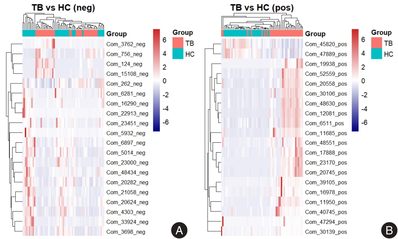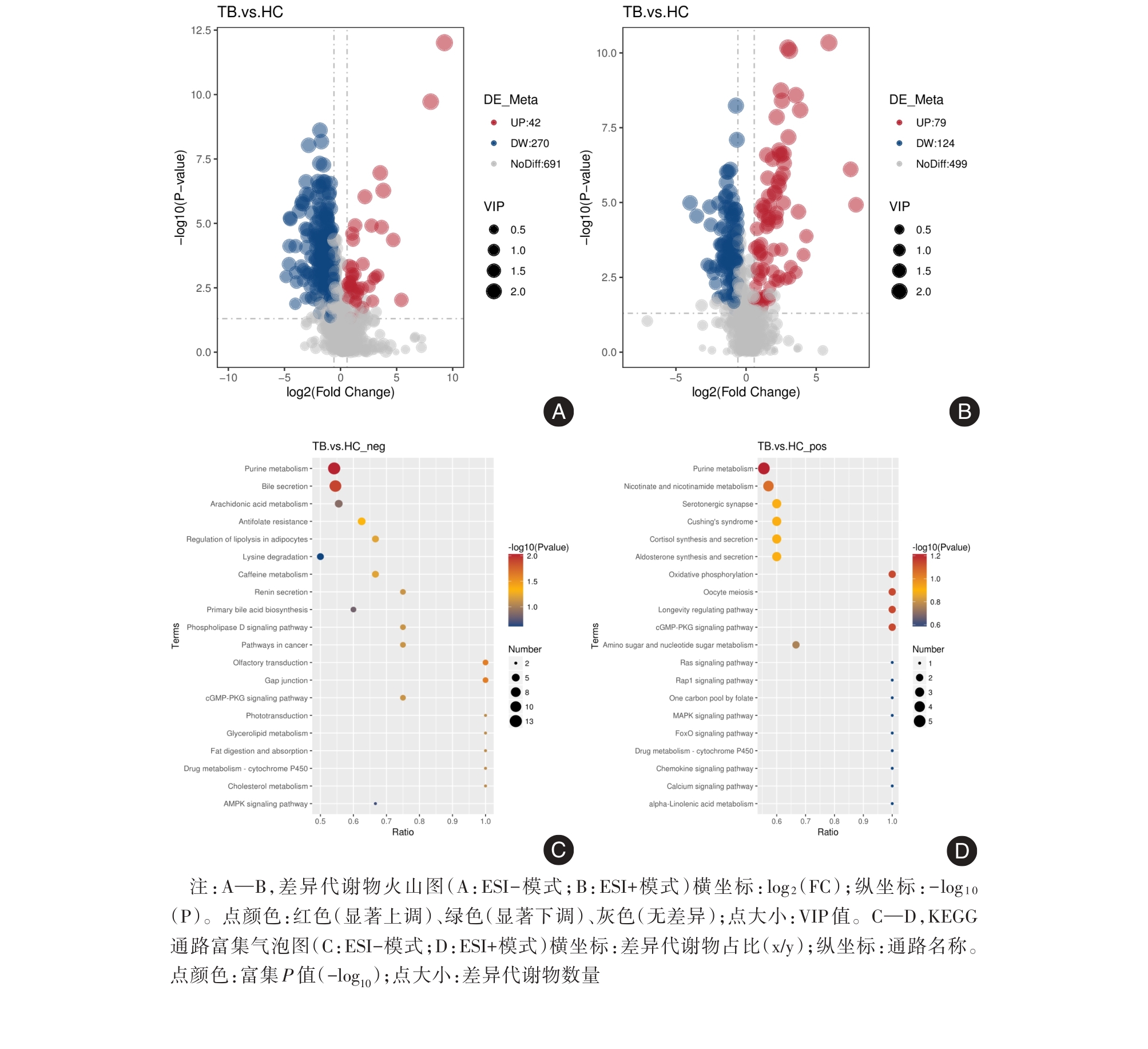 Differential metabolites between TB and HC groups in ESI+ and ESI- modes"