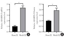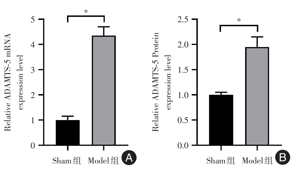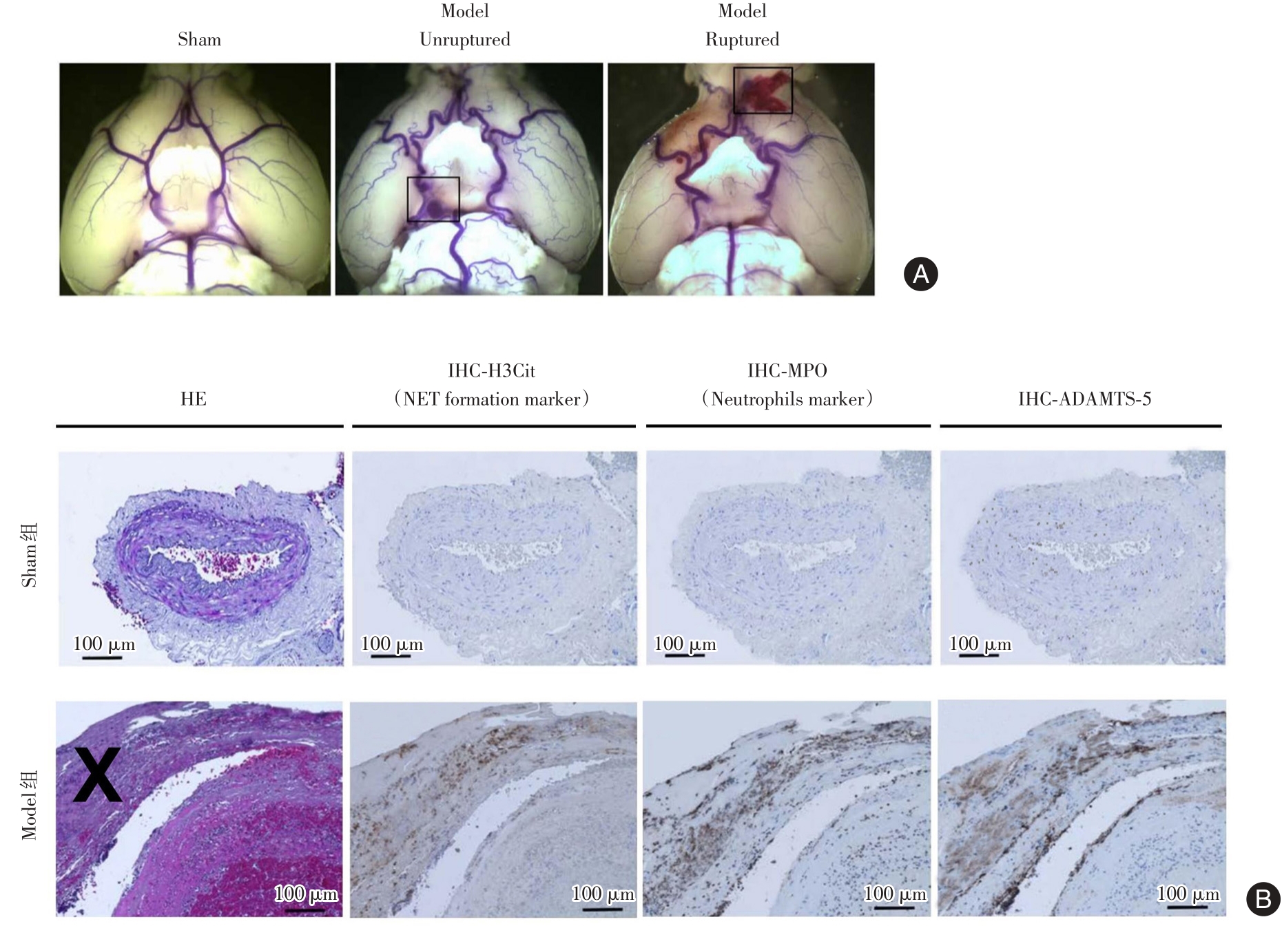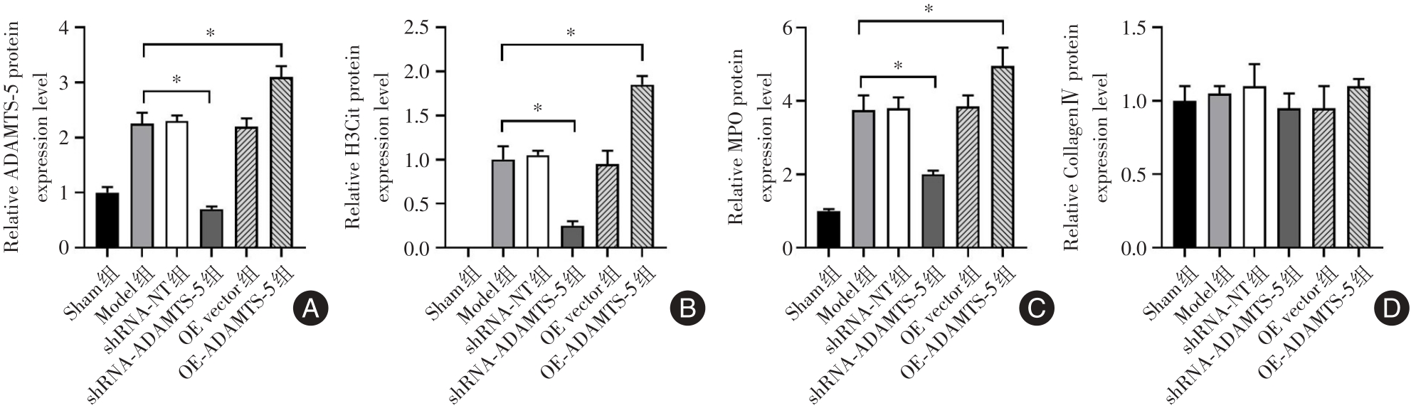 Objective To investigate the mechanism of ADAMTS-5 in accelerating the formation of neutrophil extracellular traps (NETs) and worsening the progression of intracranial aneurysm (IA). Methods IA mouse model was constructed. Adenovirus-mediated overexpression or knockdown ADAMTS-5 in arterial wall of the circle of Willis in the right cisterna of mice brain was conducted. Sixty mice were randomly divided into six groups of sham group, model group, shRNA-NT group, shRNA-ADAMTS-5 group, OE-vector group and OE-ADAMTS-5 group, with ten mice in each. H&E staining was used to analyze the infiltration of immune cells in arterial wall of the circle of Willis; and immunohistochemistry (IHC) to detect the expression of neutrophil markers MPO, neutrophil extracellular trap (NETs) markers H3Cit and ADAMTS-5 protein expression level in arterial wall of the circle of Willis. qPCR and western blot were used to analyze the expression of ADAMTS-5 mRNA and protein in arterial wall of the circle of Willis in sham group and model group. The expression of MPO, H3Cit, ADAMTS-5 and Collagen Ⅳ in arterial wall of the circle of Willis was detected by western blot. Results H&E staining showed that there were a large number of immune cells infiltrated in arterial wall of the circle of Willis in the model group, and IHC-MPO staining, IHC-H3Cit staining and IHC-ADAMTS-5 staining showed a large number of neutrophils infiltrated and NETs formed. ADAMTS-5 staining positive area overlapped with H3Cit staining positive area. Compared with that in the sham group, the expression of ADAMTS-5 mRNA and protein was higher in the model group (P < 0.05). Compared with the model group, knocking down/ overexpression ADAMTS-5 in arterial wall of the circle of Willis decreased/increased NETs formation (P < 0.05). Conclusion ADAMTS-5 plays an important role in driving formation of NETs and promoting disease progression of IA in mouse models.