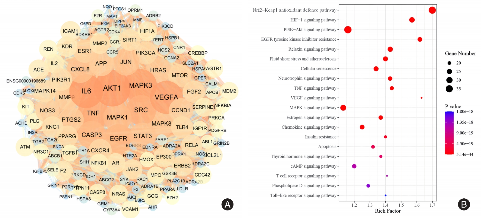 Objective The preventive effect of epigallocatechin gallate (EGCG) on hyperglycemia?induced hemorrhagic transformation (HT) was analyzed, and the underlying mechanisms were further explored. Methods Male SD rats were randomly divided into sham operation group (Sham, n = 20), model group (n = 27), hyperglycemia model group (HG, n = 43), and EGCG group (n = 43). In the model group, only the electrocoagulation cerebral ischemia model was established, and the HG group and the EGCG group were used to establish the HT model with acute hyperglycemia combined with electrocoagulation cerebral ischemia model. In addition, EGCG was administered by gavage for 5 days before cerebral ischemia at a dose of 50 mg/kg/d. Further studies confirmed the relevant targets by using network pharmacology to predict the potential targets and pathways of EGCG in the occurrence of HT. Results Compared with the model group, the mortality rate of the rats in the HG group was significantly increased [21.2% (6/27) vs. 51.2% (22/43), P < 0.05]. The mortality of rats in the EGCG group was significantly lower than that in the HG group [30.20% (13/43) vs. 51.2% (22/43), P < 0.05]. Second, mNSS, Longa score and infarct volume in the EGCG group were significantly lower than those in the HG group (P < 0.05). The incidence of HT in the HG group was higher than that in the model group (59.3% vs. 90.7%). EGCG significantly reduced the incidence of hyperglycemia?induced HT to 69.8%. Compared with the HG group, EGCG decreased the hemoglobin content from (53.42 ±?5.11) mg/dL to (37.04?±?2.39)?mg/dL respectively (P < 0.05). Network pharmacology revealed that Nrf2?Keap1?mediated neuroinflammation may be associated with hyperglycemia?induced HT. The expression of Nrf2 and Keap1 was significantly decreased and the expression of TLR4 and phosphorylation of NF?κB was significantly increased in the HG group, but EGCG reversed this process. Conclusion EGCG pretreatment prevents the occurrence of HT, which may be related to the neuroprotection mediated by activation of the Nrf2?Keap1 signaling pathway.