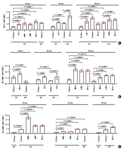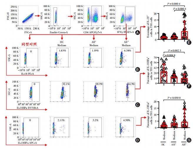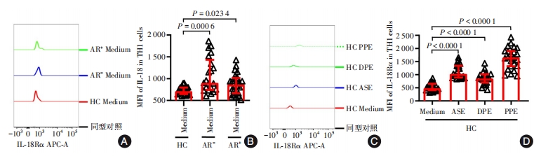 Objective To investigate the effects of allergens on the expressions of IL-18, IL-18BPa and IL-18Rα protein in peripheral blood CD4+ Th1 cells of healthy control subjects (HC) and patients with allergic rhinitis (AR), and on the expressions of IL-18, IL-18BPa and IL-18Rα mRNA in the peripheral blood CD4+ T cells. Methods Blood samples were collected from patients with rhinitis for negative skin prick test (AR-), rhinitis for positive skin prick test (AR+) and HC. Flow cytometry was used to evaluate the effects of allergens on the expressions of IL-18, IL-18BPa and IL-18Rα protein in CD4+ Th1 cells. The expressions of IL-18, IL-18BPa and IL-18Rα mRNA in CD4+ T cells were determined by qPCR. Results Compared with HC, increased IL-18 while decreased IL-18BPa expressions in Th1 cells of AR- and AR+ patients were observed, increased IL-18Rα expression in Th1 cells of AR+ patients was also found. Additionally, allergens induced elevated expression of IL-18Rα protein in Th1 cells of HC, and induced elevated mRNA expressions of IL-18, IL-18BPa and IL-18Rα in isolated blood CD4+ T cells of AR+ patients and HC. Conclusion Allergens may be involved in the pathogenesis of AR by inducing the expressions of IL-18 and IL-18Rα in blood CD4+ Th1 cells.