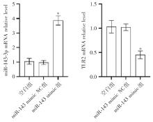 Objective To study the effect of miR-143-3p on pyroptosis of HCT-116 cells induced by LPS + ATP. Methods The targeting relationship between miR-143-3 p and TLR2 gene was detected by dual luciferase. The pyroptosis model was established after transfection of miR-143-3p mimic. Cell apoptosis was detected by flow cytometry, and the activity of Caspase-1 and LDH was detected by biochemical method. The levels of IL-1β and IL-18 were detected by ELISA. The mRNA levels of NF-κB, TLR2, NLRP3 and GSDMD were detected by q-PCR. The expression of NLRP3 and ASC was detected by immunofluorescence. The protein expressions of TLR2, GSDMD, p-NF-κB p65 and cleave Caspase-1 were detected by Western blot. Results Dual luciferase assay showed that miR-143-3p targeted TLR2 expression. The expressions of NF-κB, TLR2, NLRP3, GSDMD mRNA and TLR2, GSDMD, p-NF-κB p65, cleave Caspase-1, ASC, NLRP3 protein in miR-143-3p mimic group and si TLR2 group were lower than those in model group. The activity of Caspase-1 and the content of LDH, IL-1β and IL-18 decreased. Conclusion miR-143-3p regulates pyroptosis of ulcerative colitis cells by targeting TLR2 gene and regulating NF-κB/NLRP3/Caspase-1 signaling pathway.