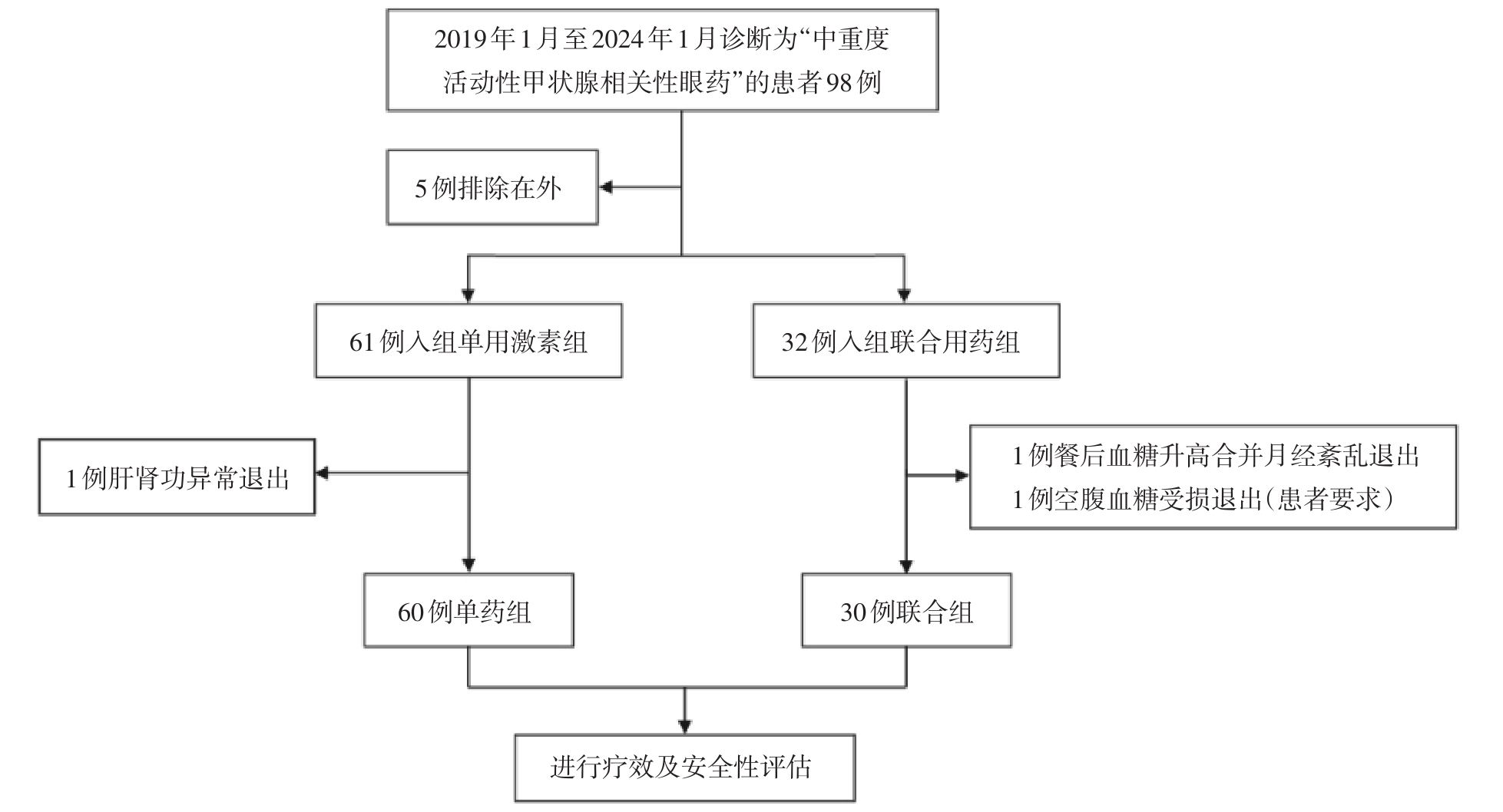 Objective To assess the effectiveness and safety of combining methylprednisolone with mycophenolate mofetil in managing moderate to severe active Graves' ophthalmopathy (GO), and to compare its efficacy against methylprednisolone monotherapy. Methods A retrospective study was conducted to select patients with moderate to severe active GO who received treatment at the Department of Endocrinology and Metabolism, Guizhou Medical University Affiliated Hospital, from January 2019 to January 2024. The patients were divided into two groups: a combination group receiving methylprednisolone combined with mycophenolate mofetil, and a monotherapy group receiving methylprednisolone alone. The objective was to compare changes in visual score, appearance score, clinical activity score (CAS), eye protrusion, eye fissure width, and eye movement between the two groups of patients while documenting any adverse events. Results A total of 98 patients were enrolled in the study, comprising 32 patients in the combination group and 61 patients in the monotherapy group. Both groups exhibited improvements in quality of life scores, CAS, and degree of protrusion following treatment compared to baseline. However, at the end of the 12?week treatment period, there was no statistically significant difference (P > 0.05) observed between the two groups regarding changes in visual scores, appearance scores, CAS, protrusion degree, fissure width, and proportion of reduced eye movement before and after treatment. Notably though, the combined therapy group demonstrated a significantly higher improvement rate for pain relief and reduction of eyelid congestion during eye movement when compared to the monotherapy group (P < 0.001). At the endpoint of treatment, there were no statistically significant differences in appearance score, protrusion degree, tear width, and reduction in eye movement between the two groups before and after treatment (P > 0.05). The combination group exhibited higher visual scores and greater improvement in CAS compared to the monotherapy group (P < 0.05), along with a higher rate of eyelid edema improvement (P < 0.05). At 12 weeks, the monotherapy group had an effective rate of 65.0%, while the combination group had an effective rate of 66.7%. By week 24, the combined group achieved an effective rate of 80.0%. The overall effectiveness at week 12 and treatment endpoints did not show any statistically significant differences between the two groups (P > 0.05). No cases of leukopenia or severe infection occurred in the combination group. Conclusions The combination therapy of methylprednisolone and mycophenolate mofetil demonstrates efficacy, tolerability, and safety in the treatment of moderate to severe active GO. While the overall effectiveness of this combination may not surpass that of hormone therapy alone, it exhibits potential superiority in improving visual scores, eyelid congestion, eyelid edema, and eye movement pain when compared to hormone therapy alone.